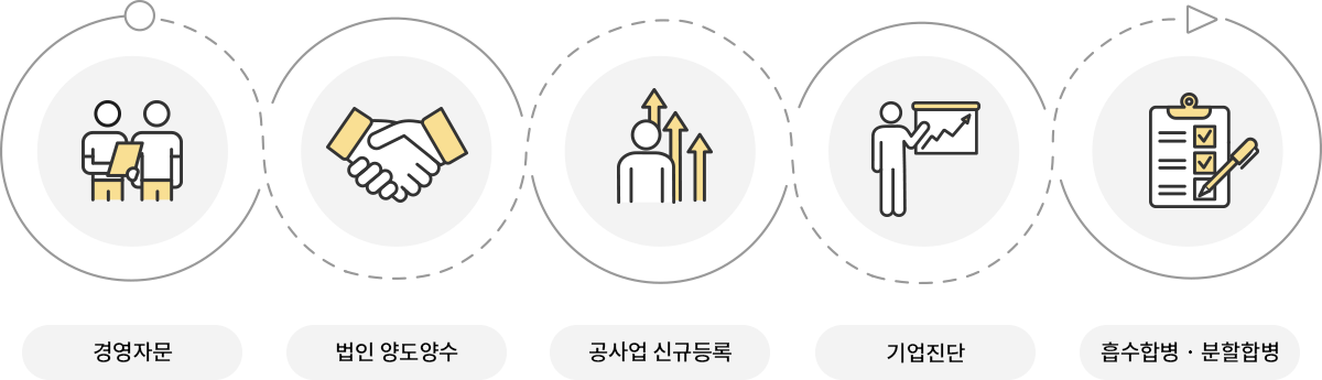 종합건설업, 전문건설업, 전기공사업, 정보통신공사업, 소방시설공사업에 대한 공사업등록, 양도양수, 분할합병 및 흡수합병, 기업진단, 경영자문 등의 업무를 정확하고 책임감있게 진행해 드립니다.